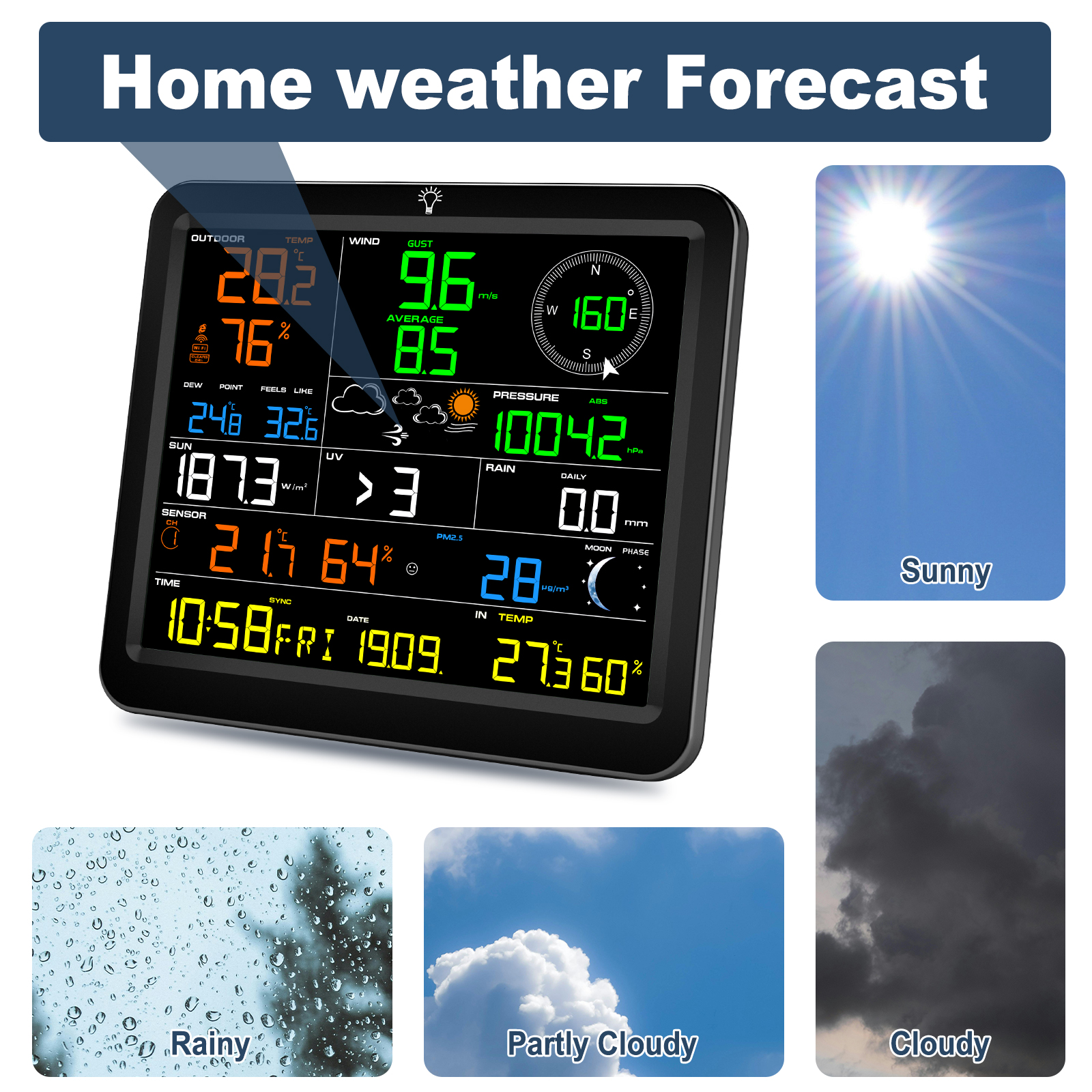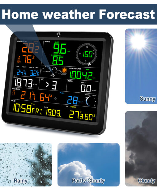 10. Weather forecast (Sunny, partly cloudy, Cloudy, Rainy), Moon Phase