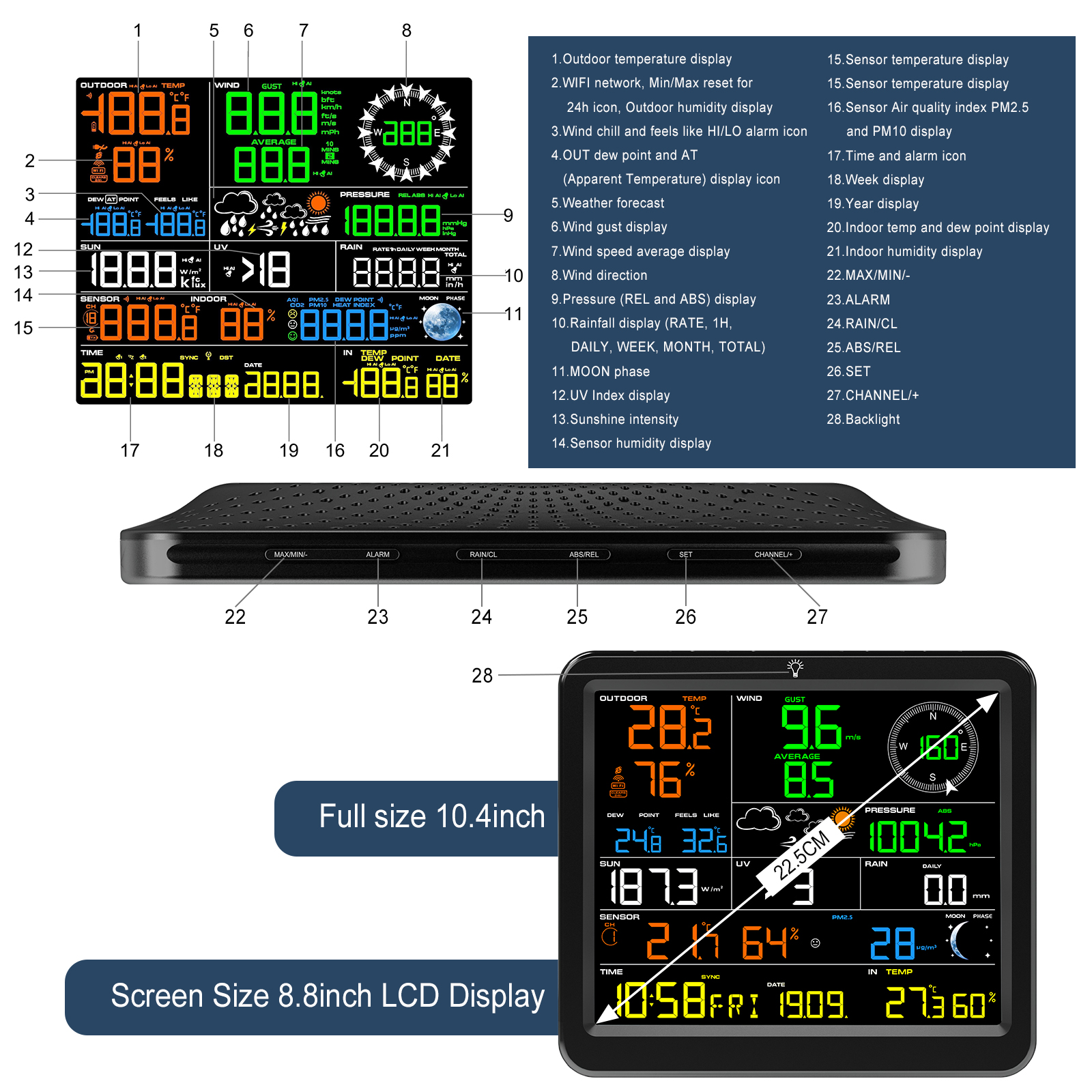 8. Wind speed and gust display(m/s, km/h, mph, knots bft or ft/s):